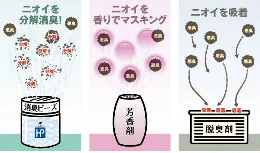 消臭剤、芳香剤、脱臭剤は、それぞれ異なる方法で臭いを管理するために使用されます。それぞれの特徴と使い分けについて詳しく説明します。